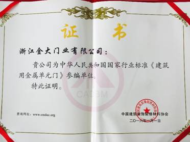 在隆重的頒獎(jiǎng)盛典上,浙江金大門(mén)業(yè)很榮幸的得到來(lái)自行業(yè)各界的肯定與支持,評(píng)為國(guó)家行業(yè)標(biāo)準(zhǔn)《建筑金屬單元門(mén)》參編單位,而總經(jīng)理崔英杰先生也被評(píng)為2015年度中國(guó)門(mén)業(yè)“十大風(fēng)云人物”。此外,金大門(mén)業(yè)積極參加國(guó)家標(biāo)準(zhǔn)《建筑用單元門(mén)通用技術(shù)條件》的制定,為促進(jìn)產(chǎn)品質(zhì)量技術(shù)進(jìn)步做出了巨大貢獻(xiàn)。
