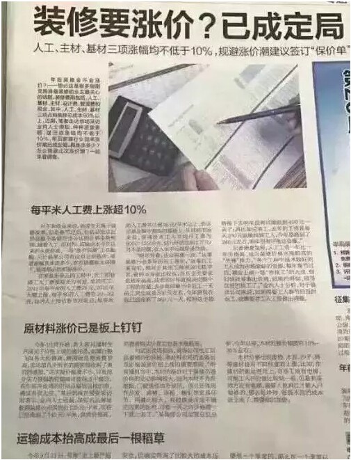 2017年,裝修市場(chǎng)成本漲價(jià)達(dá)20%~35%,所以有的東西還是早點(diǎn)定下來,漲價(jià)已成趨勢(shì),早買早賺到早裝修早賺到。