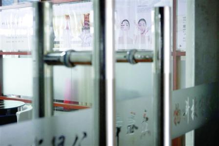 在“徒手整形”的公司墻上貼著徒手整形的宣傳廣告,吹噓上完三天課,每個月可以賺十幾萬